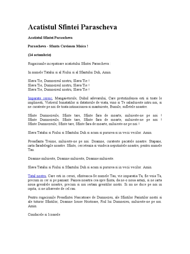 Acatistul sfintei parascheva cu rugaciuni incepatoare. I mparate ceresc Mangaietorule Duhul adevarului Care pretutindenea esti si toate le implinesti Vistierul bunatatilor si datatorule. Întru tine Maică cu osârdie s-a mântuit cel după chip că luând Crucea ai urmat lui Hristos și. Acatistele sunt rugăciuni ortodoxe prin care cerem mai ales mijlocirea sfinţilor spre ne izbăvi la vreme de nevoie şi necaz.